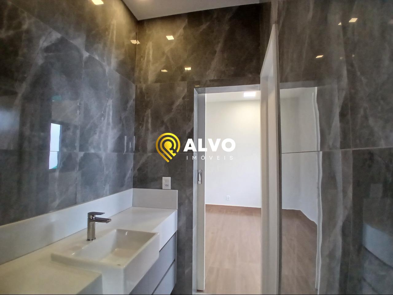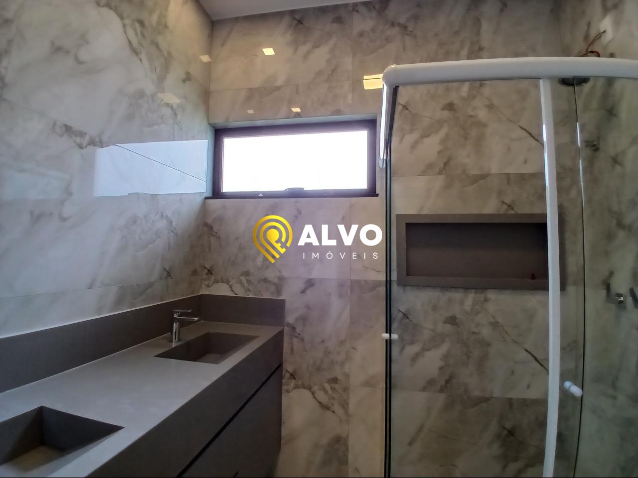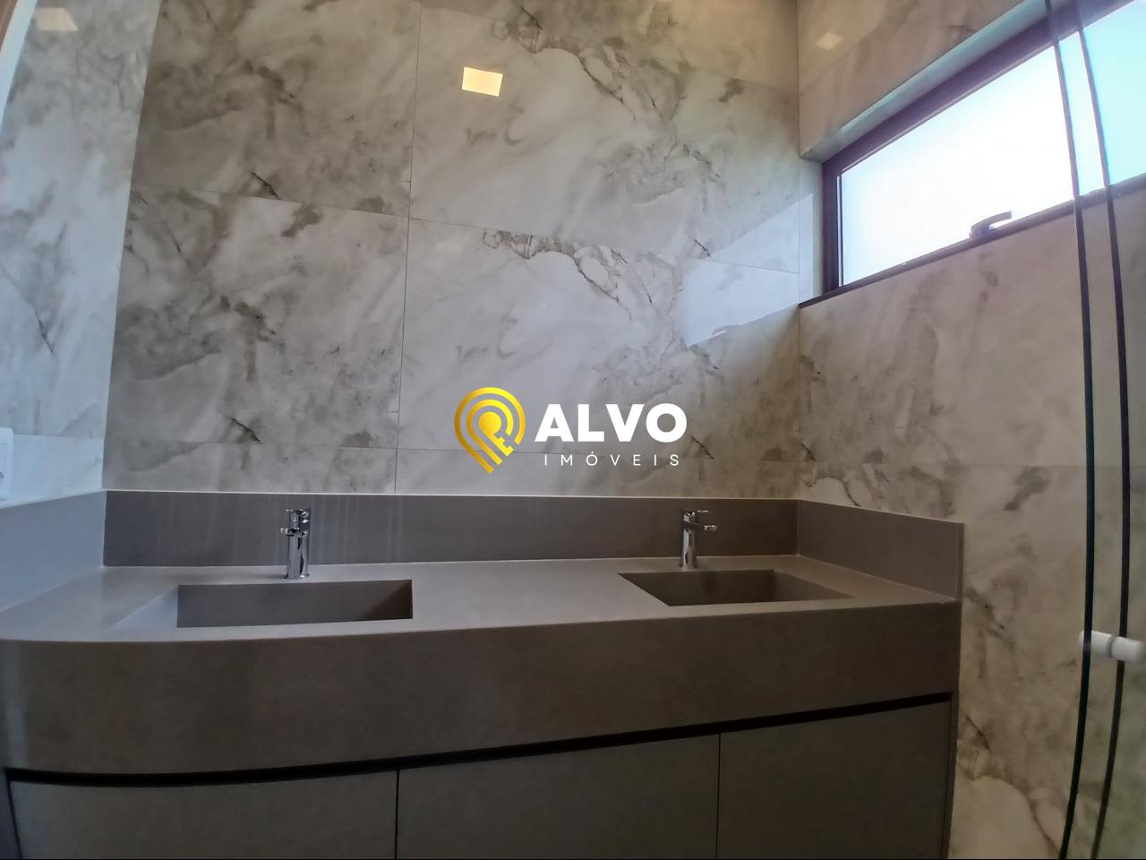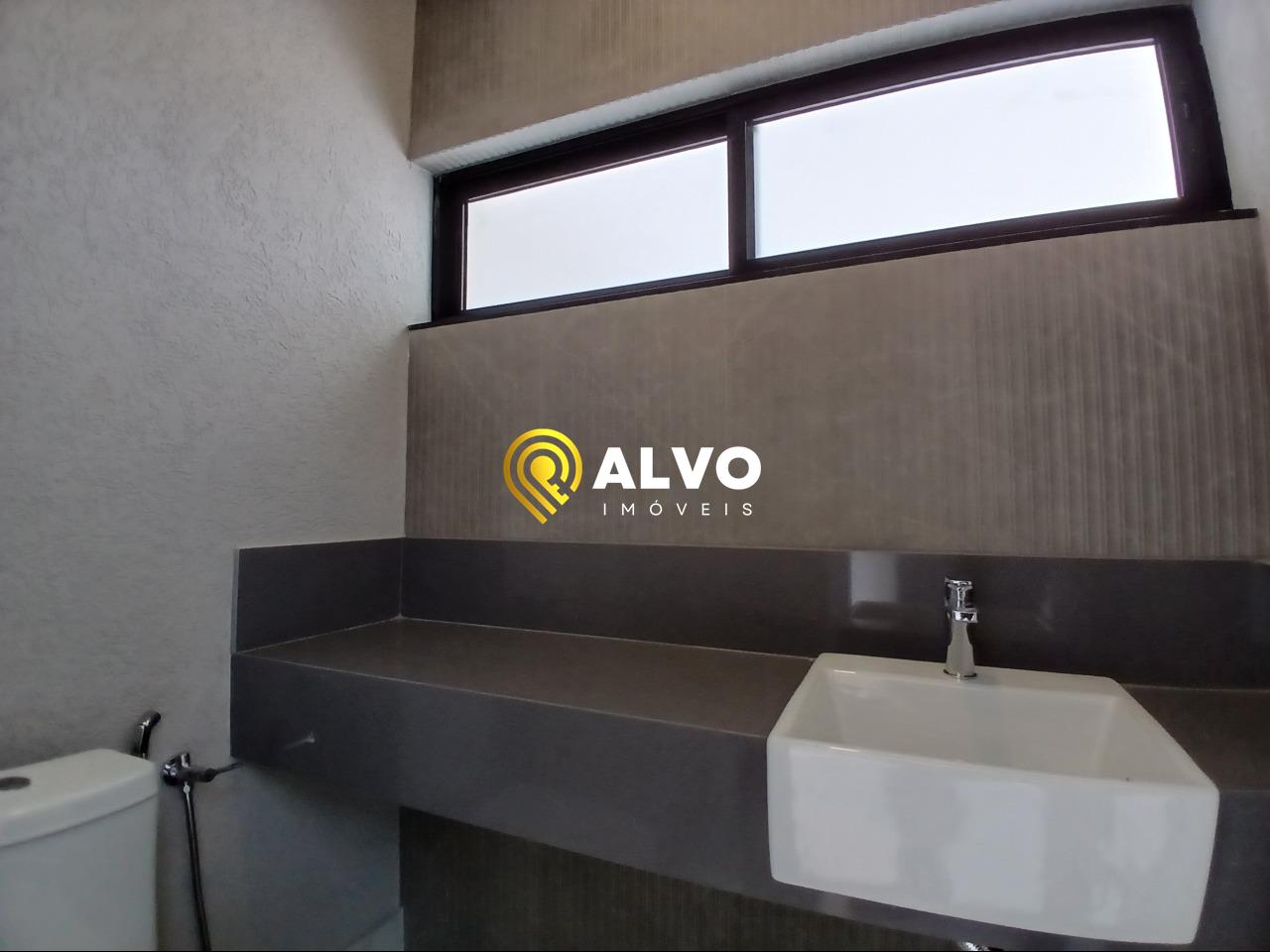 Apoio: Lavabo interno sofisticado e banheiro social na área externa para atender à piscina.