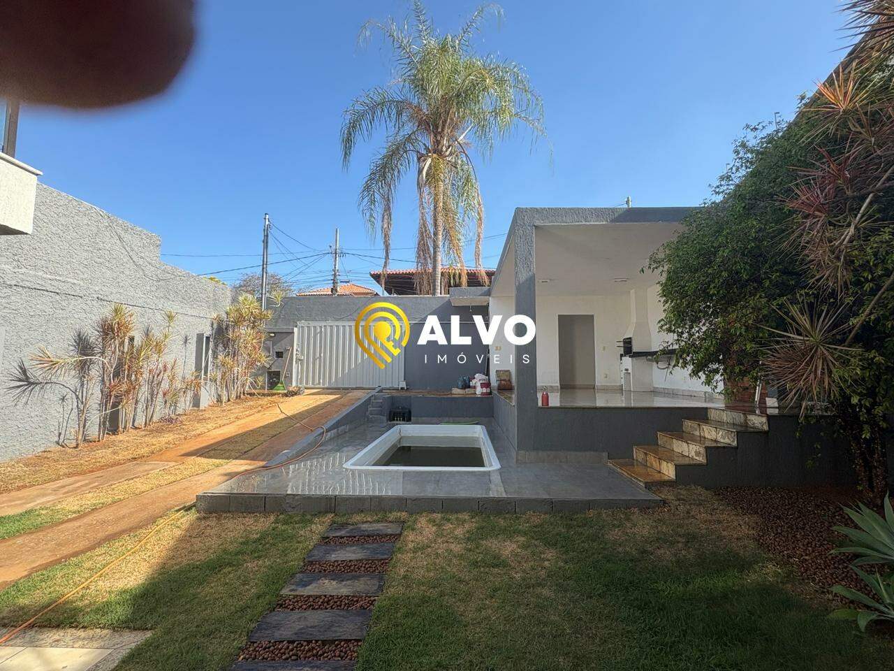 Quintal com jardim e uma jaboticabeira dando frutos, área gourmet com churrasqueira e piscina;